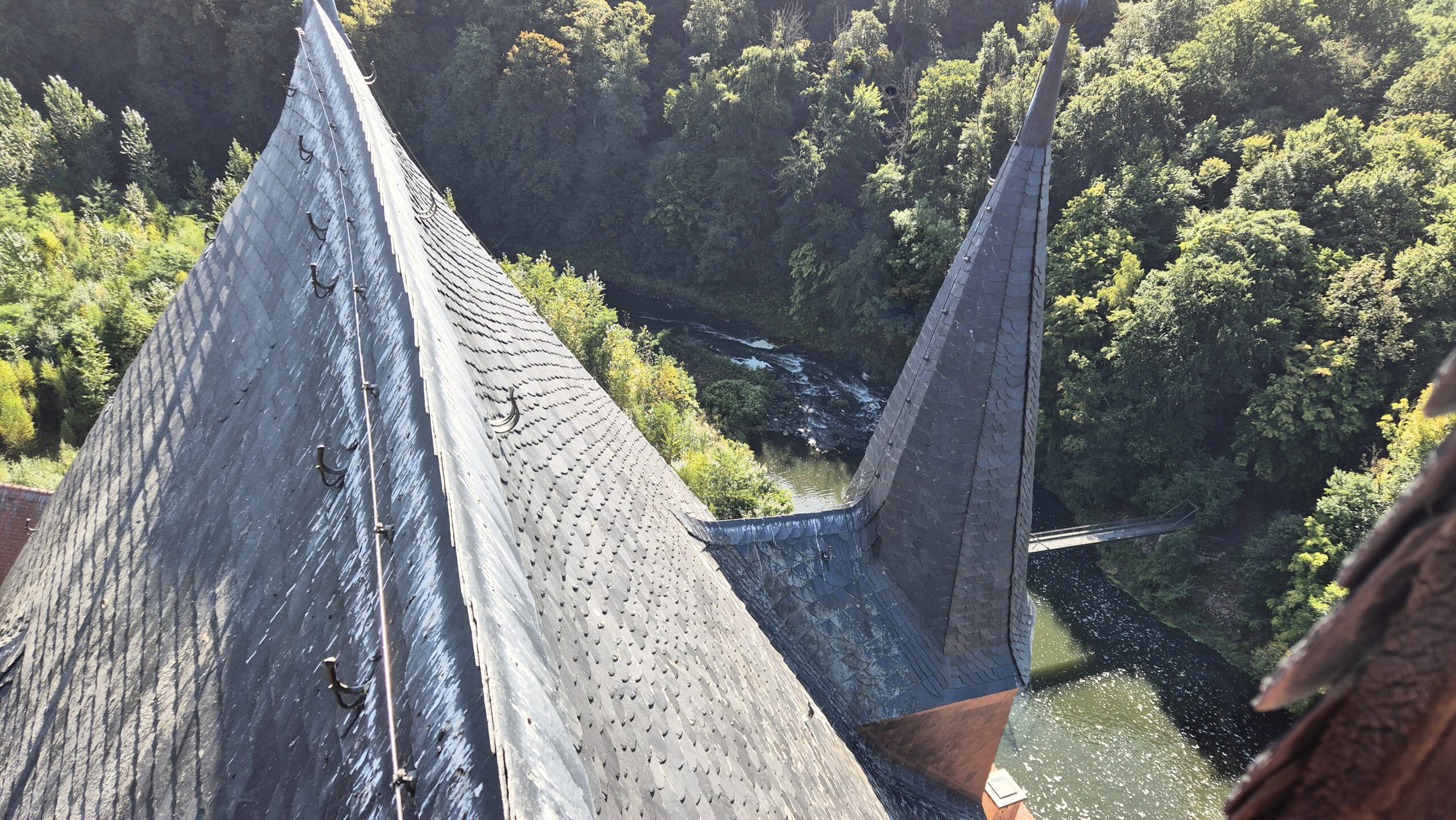 Die durchaus ungewöhnliche Konstruktion und Umbauten des 18. Jahrhunderts (beachte die beiden Schornsteinköpfe, die den Helm des Dachreiters durchstoßen!) sind dabei eine echte Herausforderung.